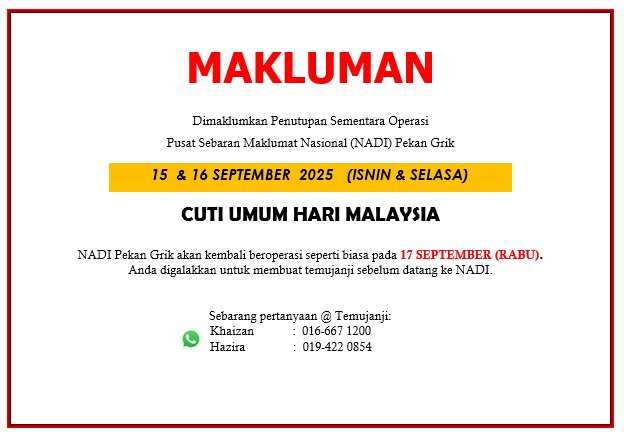 Tarikh : 21 Januari 2025Masa : 10.00 pagi – 1.00 petangLokasi : Pusat Sebaran Maklumat Nasional (NADI) GerikPeserta : Usahawan / Peniaga Tujuan Pusat Sebaran Maklumat Nasional (NADI) Gerik menyediakan ruang kepada syarikat Sikap Intan […]