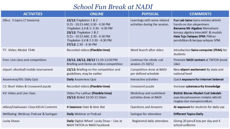 Tarikh : 14 DISEMBER 2024Masa : 09.30 Pagi – 1.00 PetangLokasi : NADI GERIKPeserta : KOMUNITI Tujuan Program pemeriksaan kesihatan kendiri percuma kini dibuka untuk ahli NADI Gerik dan kawasan sekitar. Inisiatif ini bertujuan meningkatkan kesedaran […]